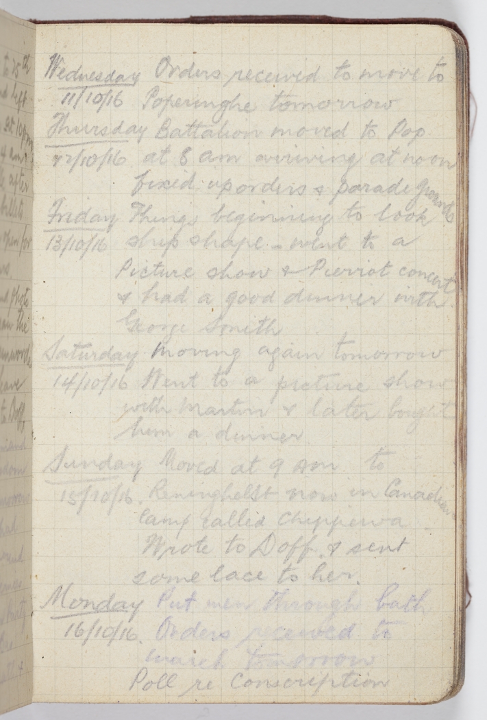 Monday 16/10/16 Put men through bath Orders received to march tomorrow. Poll re conscription