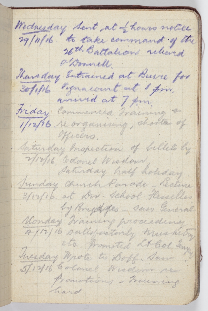 Wednesday 29/11/16 Sent at 1.2 hours notice to take command of the 26th Battalion relieved O'Donnell.