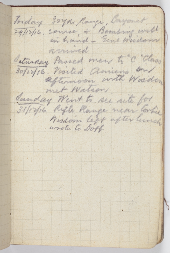 Friday 29/12/16 30 yds Range, Bayonet course, & bombing well in hand – Gen; Wisdom arrived.