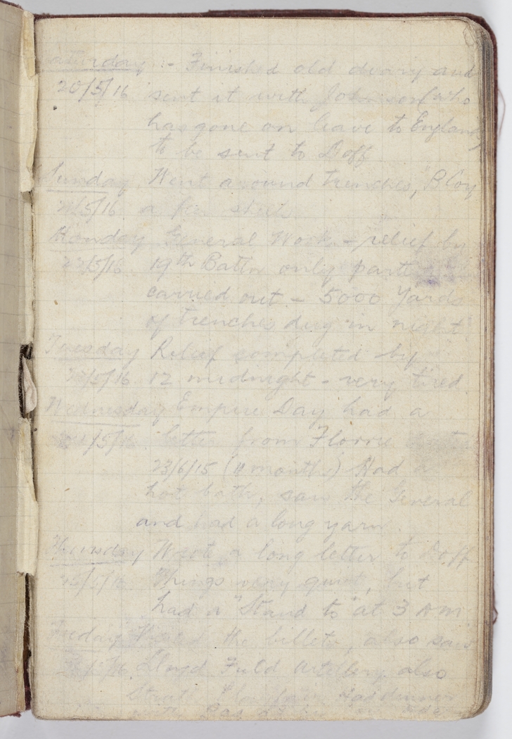 Saturday 20/5/16 – Finished old diary and sent it with Johnson (who has gone to leave to England) to be sent to Doff