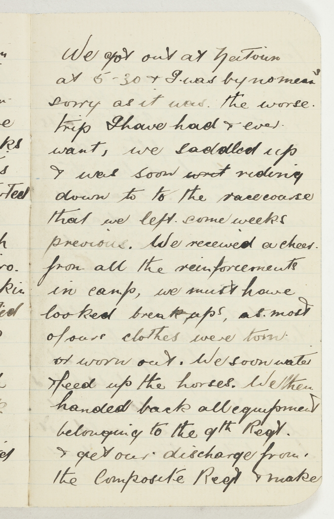 We got out at Neitoun at 5.30 & I was by no means sorry as it was the worse trip I have had & ever want, we saddled up & was soon writ riding down to to the racecoarse that we left some weeks previous. We received a cheer from all the reinforcements in camp, we must have looked breakups, as most of our clothes were torn or worn out. We soon water & feed up the horses. We then handed back all equipment belonging to the 9th Regt. & get our discharge from the Composite Regt & make