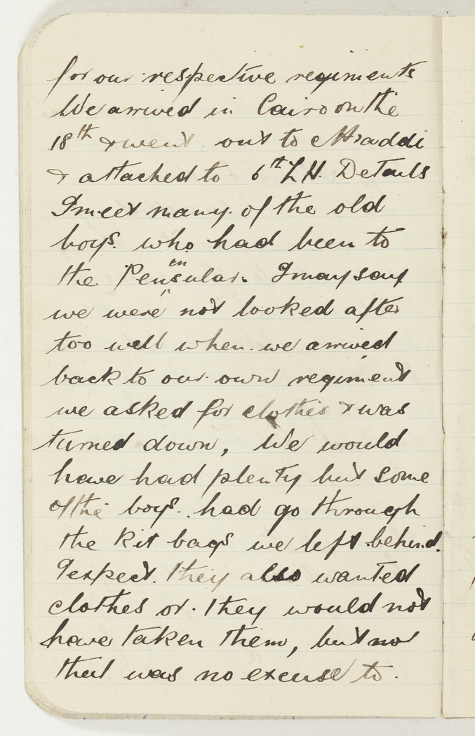 for our respective regiments. We arrived in Cairo on the 18th & went out to Maddi & attached to 6th L.H. Details. I meet many of the old boys who had been to the Peninsular. I may say we were not looked after too well when we arrived back to our own regiment we asked for clothes & was turned down, We would have had plenty but some of the boys had go through the kit bags we left behind. I expect they also wanted clothes or they would not have taken them, but not that was no excuse to