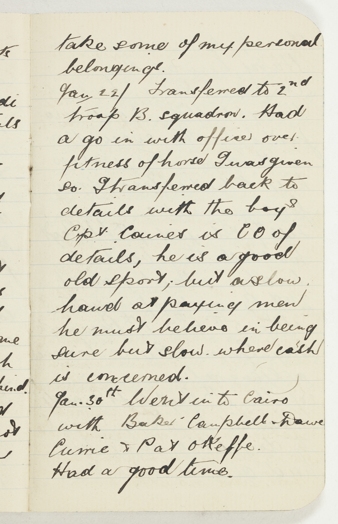 Jan 22/ Transferred to 2nd troop B. squadron. Had a go in with officer over fitness of horse I was given so I transferred back to details with the boys Capt. Caines is CO of details, he is a good old sport, but a slow hand at paying men he must believe in being sure but slow where cash is concerned.
