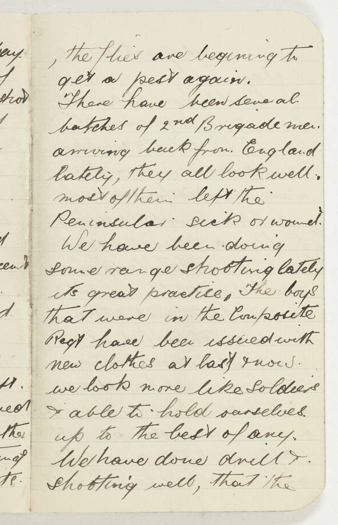 the flies are begining to get a pest again. There have been several batches of 2nd Brigade men arriving back from England lately, they all look well. Most of them left the Peninsular sick or wound. We have been doing some range shooting lately its great practise. The boys that were in the Composite Regt have been issued with new clothes at last & now we look more like soldiers & able to hold ourselves up to the best of any. We have done drill & shooting well, that the
