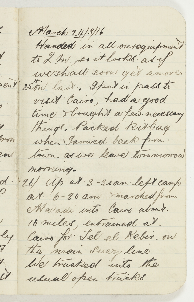 25th/ on last. I put in pass to visit Cairo, had a good time & bought a few necessary things. Packed kitbag when I arrived back from town as we leave tommorrow morning.