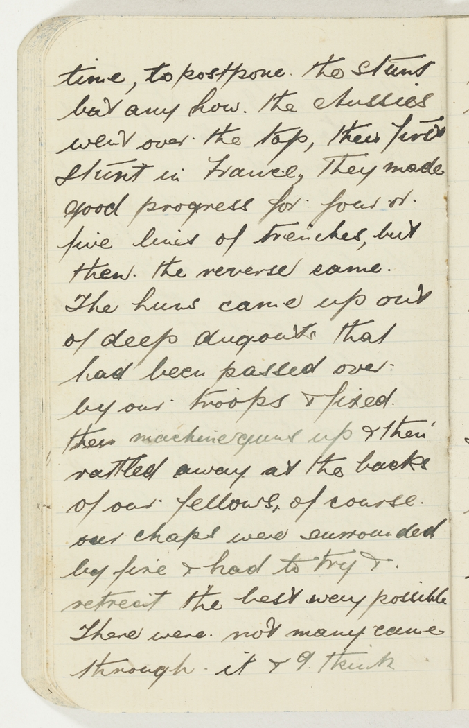 time, to postpone the stunt but any how the Aussies went over the top, their first stunt in France, they made good progress for four or five lines of trenches, but then the reverse came. The huns came up out of deep dugouts that had been passed over by our troops & fixed their machineguns up & then rattled away at the backs of our fellows, of coarse our chaps were surrounded by fire & had to try & retreat the best way possible. There were not many came through it & I think