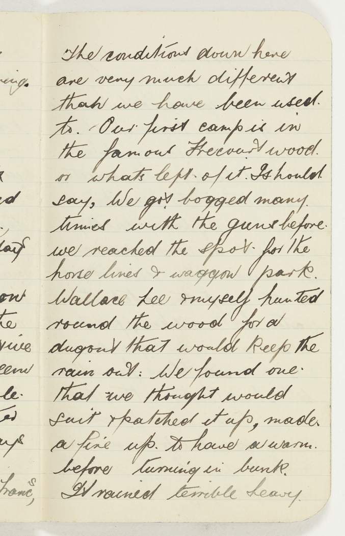 The conditions down here are very much different than we have been used to . Our first camp is in the famous Frecourt wood or whats left of it. I should say, We got bogged many times with the guns before we reached the spot for the horse lines & wagon park. Wallace Lee & myself hunted round the wood for a dugout that would keep the rain out: We found one that we thought would suit & patched it up, made a fire up to have a warm before turning in bunk. It rained terrible heavy