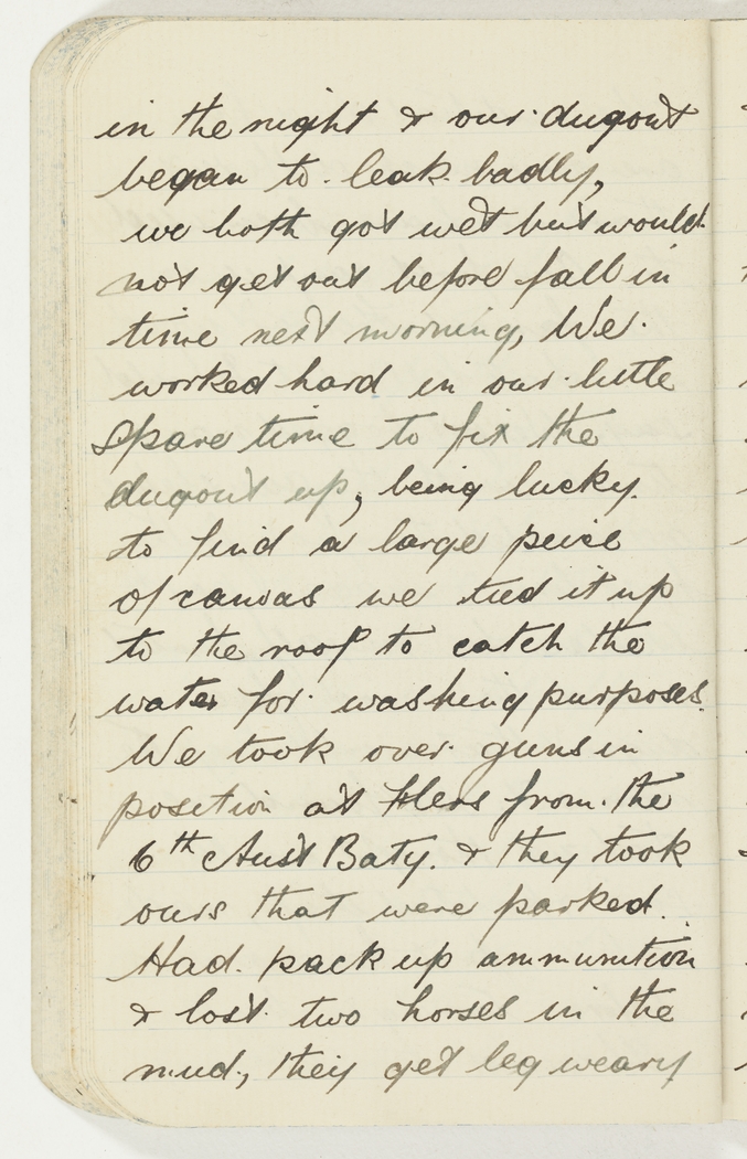 In the night & our dugout began to leak badly, we both got wet but would not get out before fall in time next morning, We worked hard in our little spare time to fix the dugout up, being lucky to find a large peice of canvas we tied it up to the roof to catch the water for washing purposes. We took over guns in position at Flers from the 6th Aust Baty. & they took ours that were parked. Had pack up ammunition & lost two horses in the mud, they get leg weary