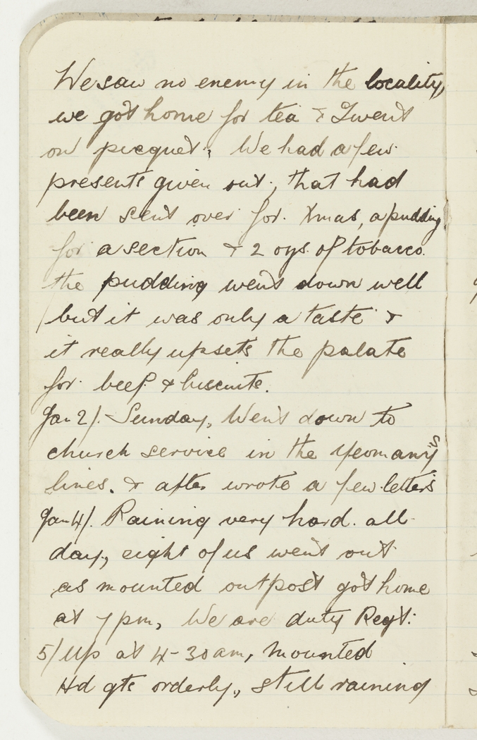 We saw no enemy in the locality, we got home for tea & I went on picquet. We had a few presents given out, that had been sent over for Xmas, a pudding for a section & 2 ozs. of tobacco. the pudding went down well but it was only a taste & it really upsets the palate for beef & biscuits.