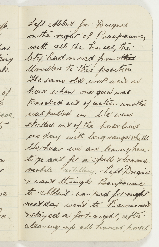 Left Albert for Doignes on the right of Baupaume, with all the horses, the bty, had moved from this Urvillers to this position. The same old work went on here when one gun was knocked out of action another was pulled in. We were shelled out of the horse lines one day with long range shells. We hear we are leaving here to go out for a spell & become mobile artillery. Left Doignes & went through Baupaume to Albert. camped for night next day went to Baveincourt & stayed a fort-night, after cleaning up all harnes, horses