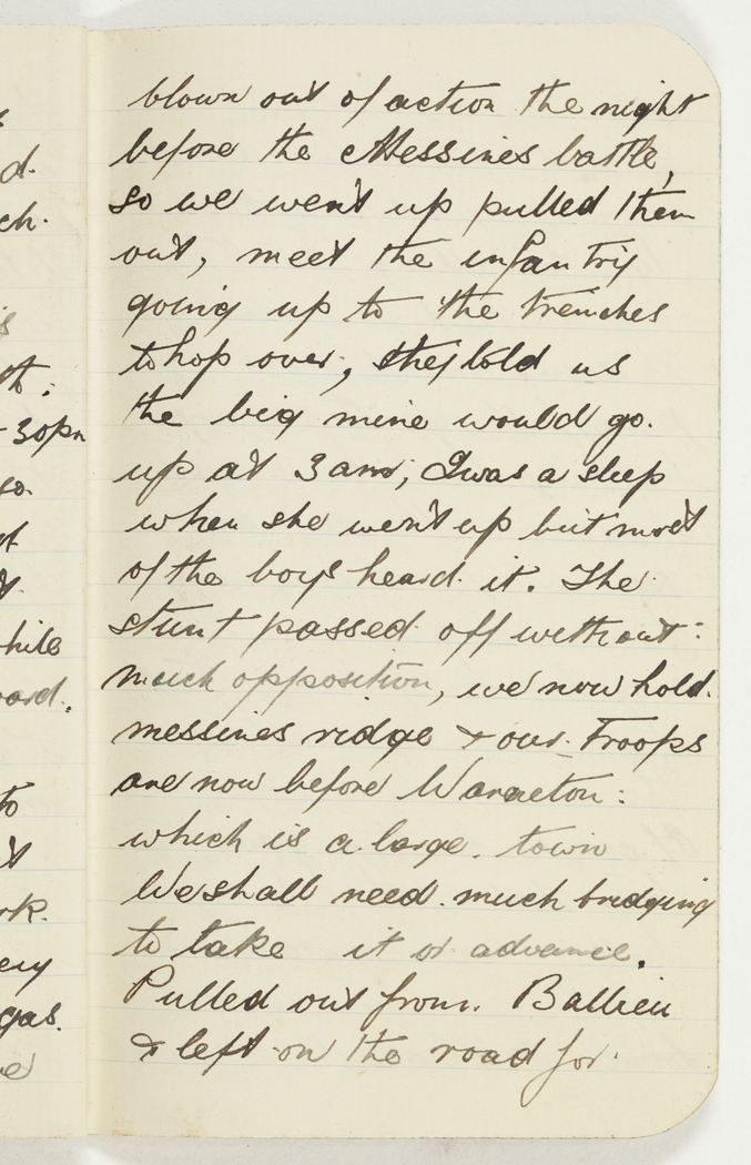 blown out of action the night before the Messines battle, so we went up pulled them out, meet the infantry going up to the trenches to hop over, they told us the big mine would go up at 3am; I was a sleep when she went up but most of the boys heard it. The stunt passed off without much opposition, we now hold messines ridge & our troops are now before Wanacton: which is a large town. We shall need much bridging to take it or advance. Pulled out from Ballieu & left on the road for