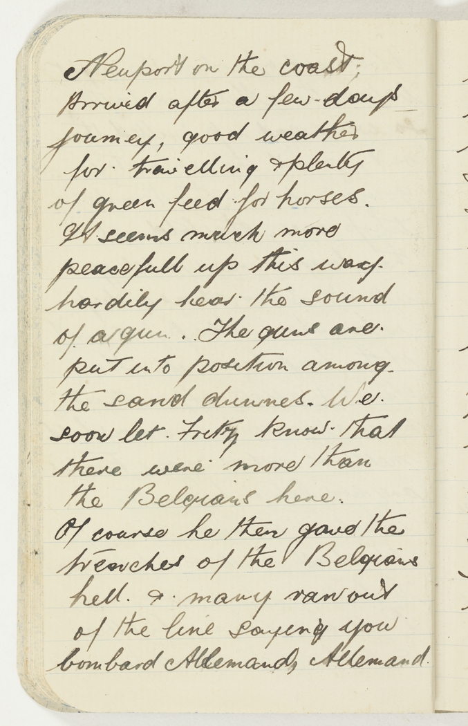 Neuport on the coast: Arrived after a few days journey, good weather for travelling & plenty of green feed for horses. It seems much more peacefull up this way hardily hear the sound of a gun. The guns are put into position among the sand dunnes. We soon let Fritz know that there were more than the Belgians here. Of coarse he then gave the trenches of the Belgians hell & many ran out of the line saying you bombard Allemand, Allemand