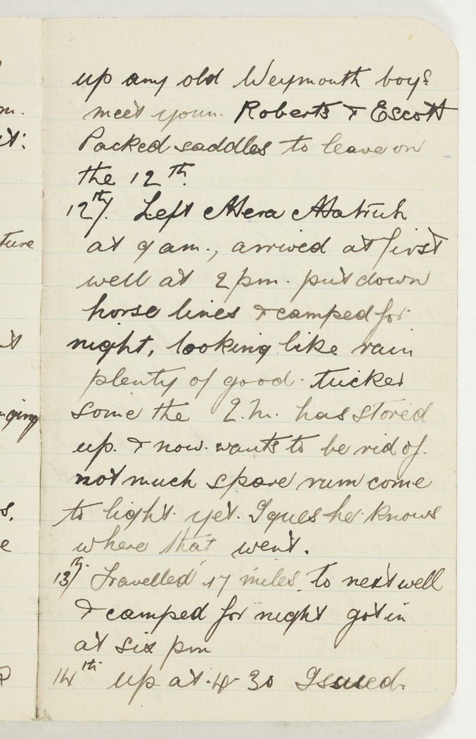 12th/Left Mera Matruh at 9 am., arrived at first well at 2pm. put down horse lines & camped for night, looking like rain plenty of good tucker some the S.M. has stored up & now wants to be rid of. not much spare rum come to light yet. I gues he knows where that went.