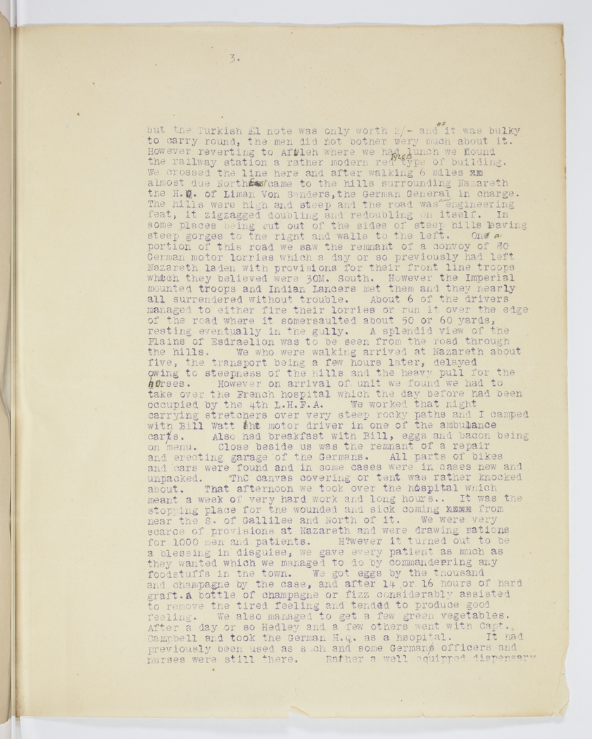 but the Turkish £1 note was only worth 2/- and as it was bulky to carry round, the men did not bother very much about it. However reverting to the Afulen where we had lunch we found the railway station a rather modern red tiled type of building. We crossed the line here and after walking a mile xx almost due North East came to the hills surrounding Nazareth the H.O. of Liman von Sanders, the German General in charge. The hills were high and steep and the road was an engineering feat, it zigzagged doubling and redoubling on itself. In some places being cut out of the sided of steep hills leaving steep gorges to the right and walls to the left. One a portion of this road we saw the remnant of a convey of 80 German motor lorries which a day or so previously had left Nazareth laden with provisions for their front line troops which they believed were 30M. South. However the Imperial mounted troops and Indian lancers met them and they nearly all surrendered without trouble. About 6 of the drivers managed to either fire their lorries or run it over the edge of the road where it somersaulted about 50 or 60 yards, resting eventually in the gully. A splendid view of the Plains of Esdraelion was to be seen from the road through the hills. We who were walking arrived at Nazareth about five, the transport being a few hours later, delayed owing to steepness of the hills and the heavy pull for the horses. However on arrival of unit we found we had to take over the French hospital which the day before had been occupied by the 4th L.H.F.A. We worked that night carrying stretchers over very steep rocky paths and I camped with Bill Watt the motor driver in one of the ambulance cars. Also had breakfast with Billy, eggs and bacon being on menu. Close beside us was the remnant of a repair and erecting garage of the Germans. All parts of bikes and cars were found and in some cases were in cases new and unpacked. The canvas covering or tent was rather knocked about. That afternoon we took over the hospital which meant a week of very hard work and long hours.. It was the stopping place for the wounded and sick coming back from near the S. of Gallilee and North of it. We were very scarce of provisions at Nazareth and were drawing rations for 1000 men and patients. However it turned out to be a blessing in disguise, we gave every patient as much as they wanted which we managed to do by commandeering any food stuffs in the town. We got eggs by the thousand and champagne by the case, and after 14 or 16 hours of hard graft. A bottle of champagne or fizz considerably assisted to remove the tired feeling and tended to produce good feeling. We also managed to get a few green vegetables. After a day or so Hedley and a few others went with Capt. Campbell and took the German H.Q. as a hospital. It had previously been used as such and some German officers and nurses were still there. Rather a well equipped dispensary