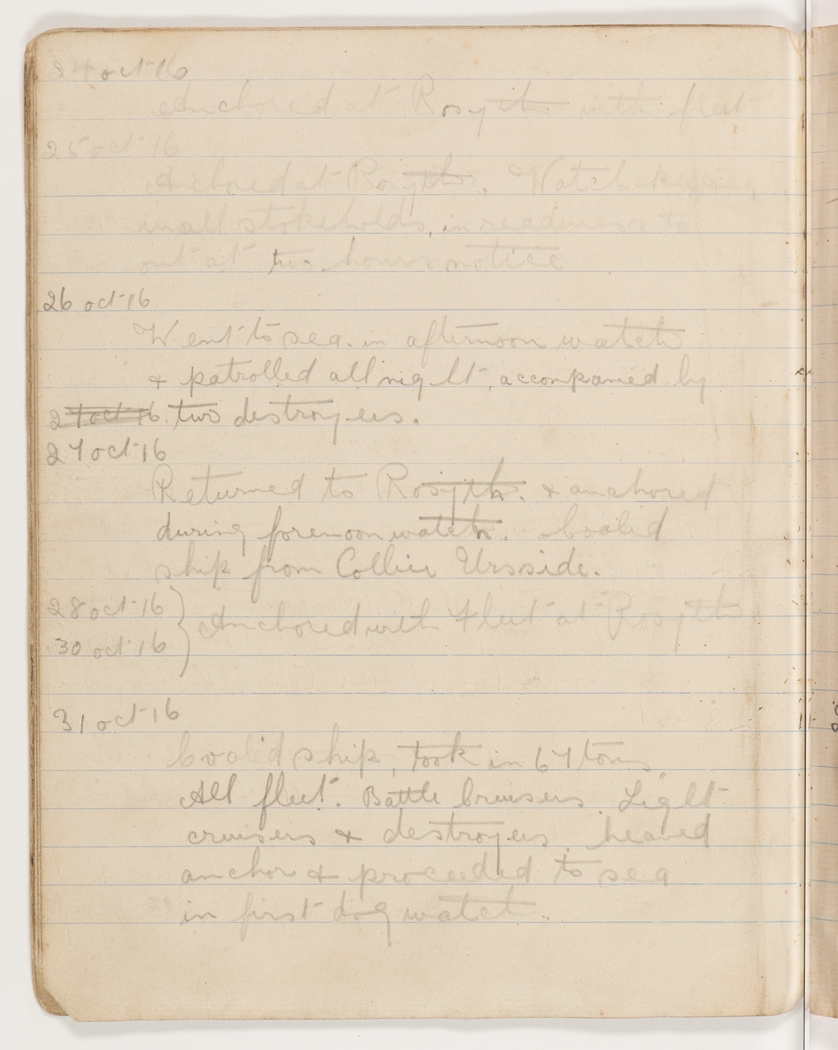 Anchored at Rosyth. Watch [indecipherable] in all stokeholds, in readiness to out at two hours notice.