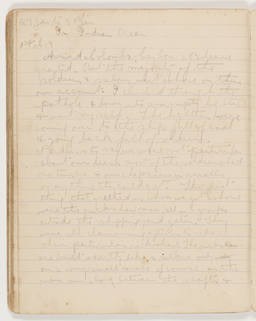 Arrived Colombo, Ceylon. No leave granted, but the majority of the soldiers & sailors went ashore on their own account. I climbed through the porthole & down into an empty lighter & went myself. The lighters were coming over to the ship full of coal & going back full of soldiers.
