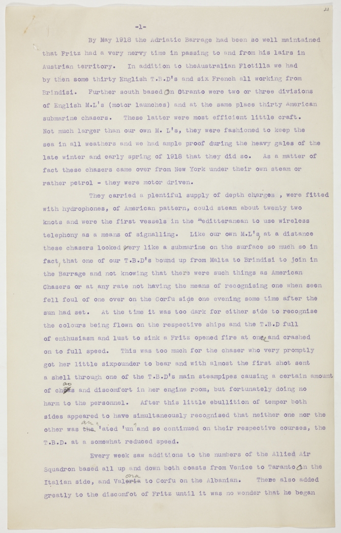 They carried a plentiful supply of depth charges, were fitted with hydrophones, of American pattern, could steam about twenty two knots and were the first vessels in the Meditteranean [Mediterranean] to use wireless telephony as a means of signalling. Like our own M.L's, at a distance these chasers looked very like a submarine on the surface so much so in fact, that one of our T.B.D's bound up from Malta to Brindisi to join in the Barrage and not knowing that there were such things as American Chasers or at any rate not having the means of recognising one when seen fell foul of one over on the Corfu side one evening some time after the sun had set. At the time it was too dark for either side to recognise the colours being flown on the respective ships and the T.B.D full of enthusiasm and lust to sink a Fritz opened fire at once and crashed on to full speed. This was too much for the chaser who very promptly got her little sixpounder to bear and with almost the first shot sent a shell through one of the T.B.D's main steampipes causing a certain amount of chaos and discomfort in her engine room, but fortunately doing no harm to the personnel. After this little ebullition of temper both sides appeared to have simultaneously recognised that neither one nor the other was the an "'ated 'un" and so continued on their respective courses, the T.B.D. at a somewhat reduced speed.