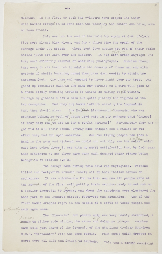 This was not the end of the raid for again at 6.0 o'clock five more planes blew along, and for a third time the crash of the barrage broke out afresh. These last five having got rid of their bombs sailed quite low down over the harbour. It was soon now broad daylight, and they were evidently wishful of obtaining photographs. Enemies though they were, it was hard not to admire the courage of these men who with myriads of shells bursting round them, came down coolly to within two thousand feet. One came, and appeared to hover right over our trot. One gazed up facinated much in the same way perhaps as a bird will gaze at a snake slowly crawling towards it intent on making it its victim. Through my glasses I could make out quite plainly the figures of the two occupants. Had they any bombs left it seemd quite impossible that they should miss. The Engr. Lieutennant-Commander who was standing behind me - both of us being clad only in our pyjamas - said "Cripes! if they drop one now we are in for a re-fit alright!" Fortunately they had got rid of all their bombs, anyway none dropped and a minute or two after they had all sped seawards. Our own flying people now took a hand in the game, and although we could not actually see the melee, which must have taken place, it was with no small satisfaction that by 3.0 p.m. that afternoon we saw three more very much damaged enemy planes being brought in by Italian T.B's.