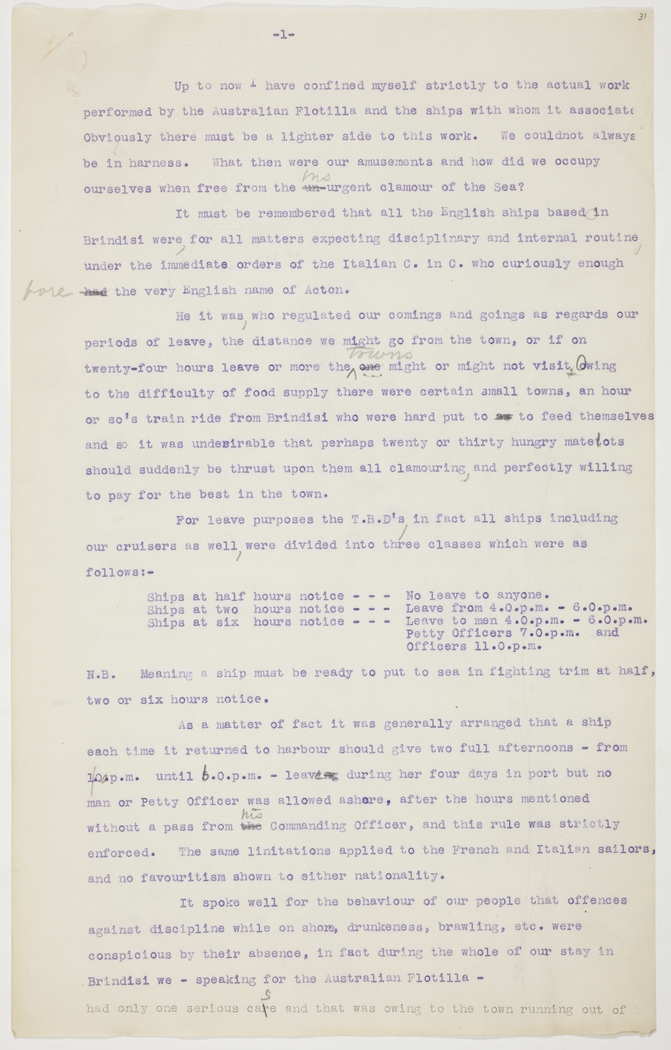 It spoke well for the behaviour of our people that offences against discipline while on shore, drunkeness, brawling, etc. were conspicuous by their absence, in fact during the whole of our stay in Brindisi we - speaking for the Australian Flotilla - had only one serious case and that was owing to the town running out of