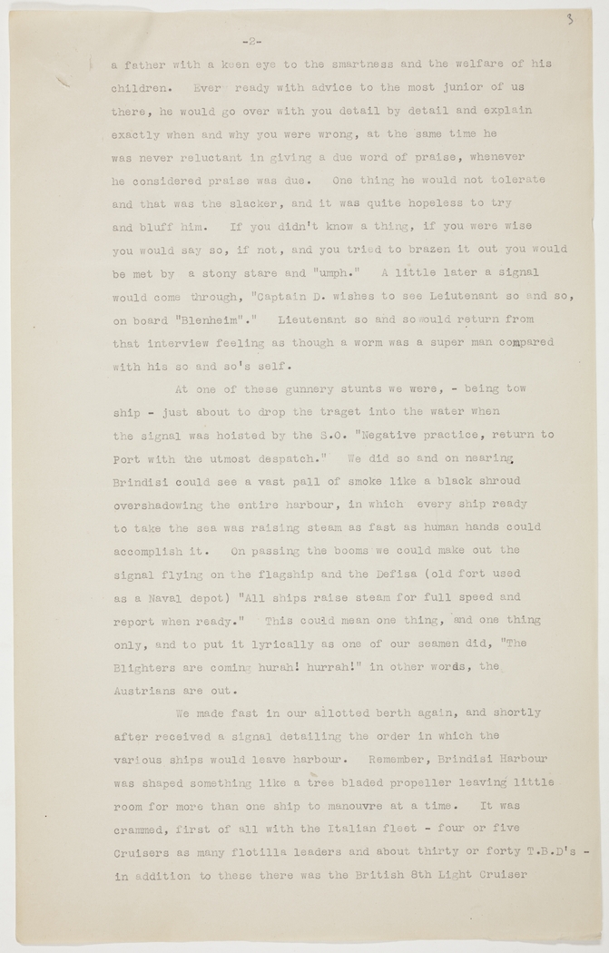 a father with a keen eye to the smartness and the welfare of his children. Ever ready with advice to the most junior of us there, he would go over with you detail by detail and explain exactly when and why you were wrong, at the same time he was never reluctant in giving a due word of praise, whenever he considered praise was due. One thing he would not tolerate and that was the slacker, and it was quite hopeless to try and bluff him. If you didn't know a thing, if you were wise you would say so, if not, and you tried to brazen it out you would be met by a stony stare and "umph." A little later a signal would come through, "Captain D. wishes to see Lieutenant so and so, on board "Blenheim"." Lieutenant so and so would return from that interview feeling as though a worm was a super man compared with his so and so's self.