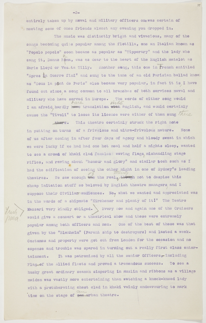 The music was distinctly bright and vivacious, many of  the songs becoming quite popular among the flotilla, one an Italian known as "Popolo popolo" soon became as popular as "Tipperary" and the lady who sang it, Donno Ruoma,  was as dear to the heart of the English matelot as Marie Lloyd or Vesta Tilly. Another song, this one in French entitled "Apres La Guerre fini" and sung to the tune of an old Parisian ballad known as "Sous la pont de Paris" also became very popular, in fact it is, I have found out since, a song common to all branches of both services naval and military who have served in Europe. The words of either song would I am afraid, hardly have   bare translation with into English, and would certainly cause the "Tivoli" to loose its licence were either of them sung there.