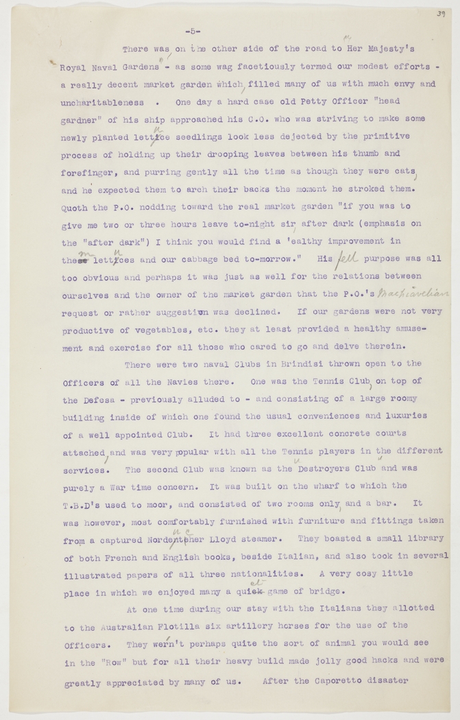 At one time during our stay with the Italians they alloted to the Australian flotilla six artillery horses for the use of the Officers. They weren't perhaps quite the sort of animal you would see in the "Row" but for all their heavy build made jolly good hacks and were greatly appreciated by many of us. After the Caporetto disaster