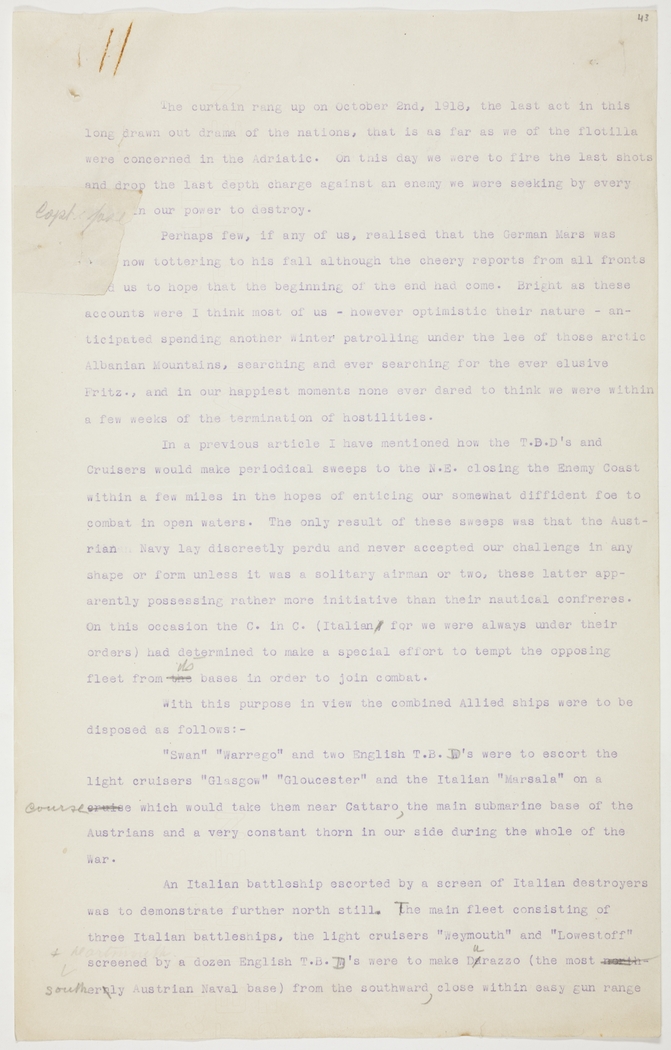 "Swan" "Warrego" and two English T.B.D.s were to escort the light cruisers "Glasgow" "Gloucester" and the Italian "Marsala" on a cruise course which would take them near Cattaro, the main submarine base of the Austrians and a very constant thorn in our side during the whole of the War.