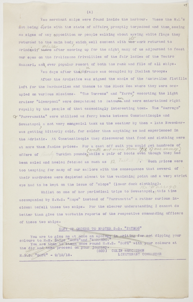 Whilst on one of her periodical trips to Sevastopol, the "Warrego" this time accompanied by H.M.S. "Hope" instead of "Parramatta" a rather curious incident befell these two ships. For the clearer understanding I cannot do better than give the verbatim reports of the respective commanding officers of these two ships.