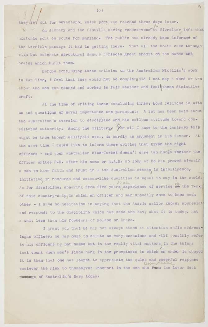 At the time of writing these concluding lines, Lord Jellicoe is with us and questions of naval importance are paramount. A lot has been said about the Australian's aversion to discipline and his callous attitude toward constituted authority, among the military and, for all I know to the contrary this might be true though Gallipoli etc., is hardly an argument in its favour. At the same time I would like to inform these critics that given the right officers - and your Australian Blue-Jacket doesn't care two hoots whether the Officer writes R.N. after his name or R.A.N. so long as he has proved himself a man to have faith and trust in - the Australian seaman, in intelligence, initiative, in resource and seaman-like qualities is equal to any in the world. As for discipline, speaking from five years war experience of service in the T.B.D. of this country - ships in which an officer and man speedily come to know each other - I have no hesitation in saying that the Aussie sailor knows, appreciates and responds to the discipline which has made the Navy what it is today, not a whit less than his forbears of Nelson or Drake.
