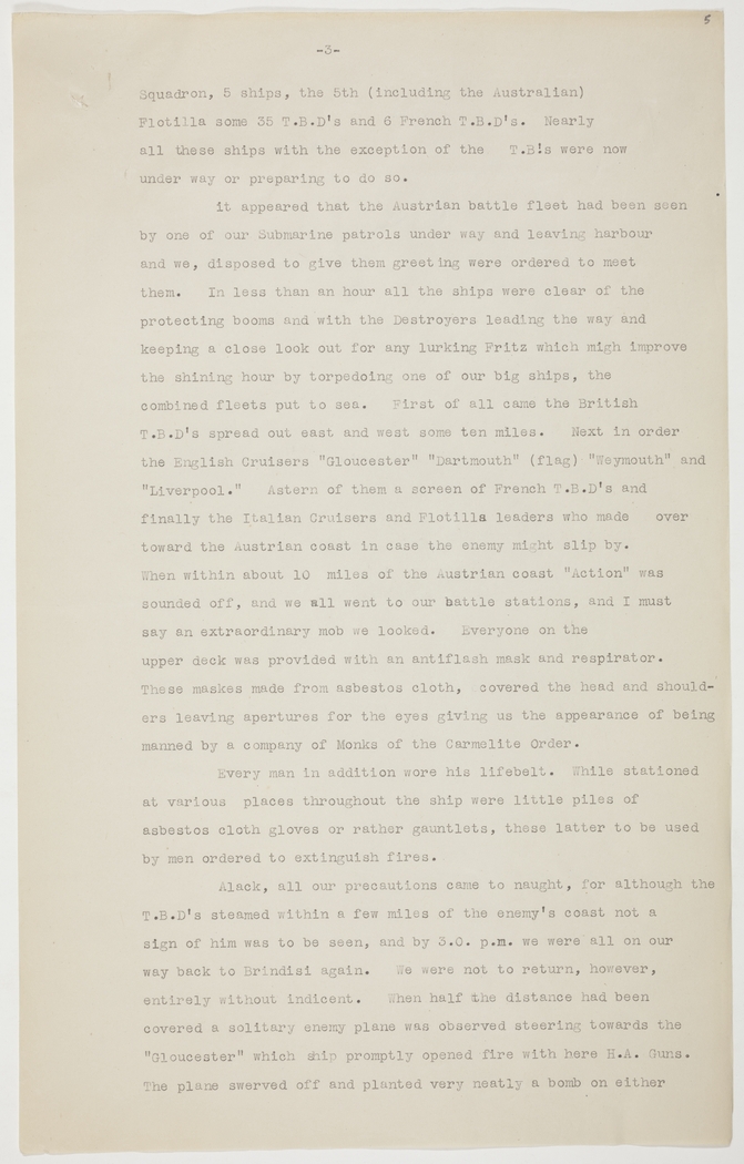 It appeared that the Austrian battle fleet had been seen by one of our Submarine patrols under way and leaving harbour and we, disposed to give them greeting were ordered to meet them. In less than an hour all these ships were clear of the protecting booms and with the Destroyers leading the way and keeping a close look out for any lurking Fritz which migh improve the shining hour by torpedoing one of our big ships, the combined fleets put to sea. First of all came the British T.B.D's spread out east and west some ten miles. Next in order the English Cruisers "Gloucester" "Dartmouth" (flag) "Weymouth" and "Liverpool." Astern of them a screen of French T.B.D's and finally the Italian Cruisers and Flotilla leaders who made over toward the Austrian coast in case the enemy might slip by. When within about 10 miles of the Austrian coast "Action" was sounded off, and we all went to our battle stations, and I must say an extraordinary mob we looked. Everyone on the upper deck was provided with an antiflash mask and respirator. These masks made from asbestos cloth, covered the head and shoulders leaving apertures for the eyes giving us the appearance of being manned by a company of Monks of the Carmelite Order.