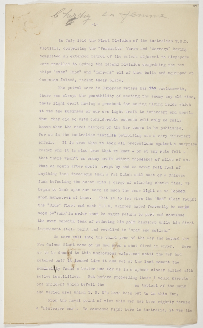 We were well into the third year of the War and beyond the New Guinea Stunt none of us had seen a shot fired in anger. Were we to be doomed to this unglorious existence until the War had petered out? It looked like it and yet at the last moment the Admiralty found a better use for us in a sphere closer allied with active hostilities. But before proceeding there I would narrate one incident which befell the --- as typical of the many and varied uses which T.B.D's have been put to in this War.