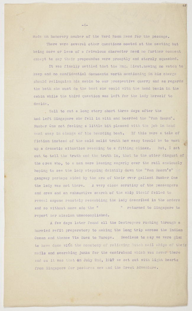 Well to cut a long story short three days after the -- had left Singapore she fell in with and boarded the "Van Hoorn". Number One not feeling a little bit pleased with the job in hand went away in charge of the boarding boat. If this were a tale of fiction instead of the cold solid truth how easy it would be to work up a dramatic situation reaching to a fitting climax. But, I set out to tell the truth and the truth is, that to the utter disgust of the crew who, to a man were leaning eagerly over the rail anxiously hoping to see the lady stepping daintily down the "Van Hoorn's" gangway perhaps sided by the arm of their ever gallant Number One, the lady was not there. A very close scrutiny of the passengers and crew and an exhaustive search of the ship itself failed to reveal anyone remotely resembling the lady described in the orders and so without more ado the -- returned to Singapore to report her mission unaccomplished.