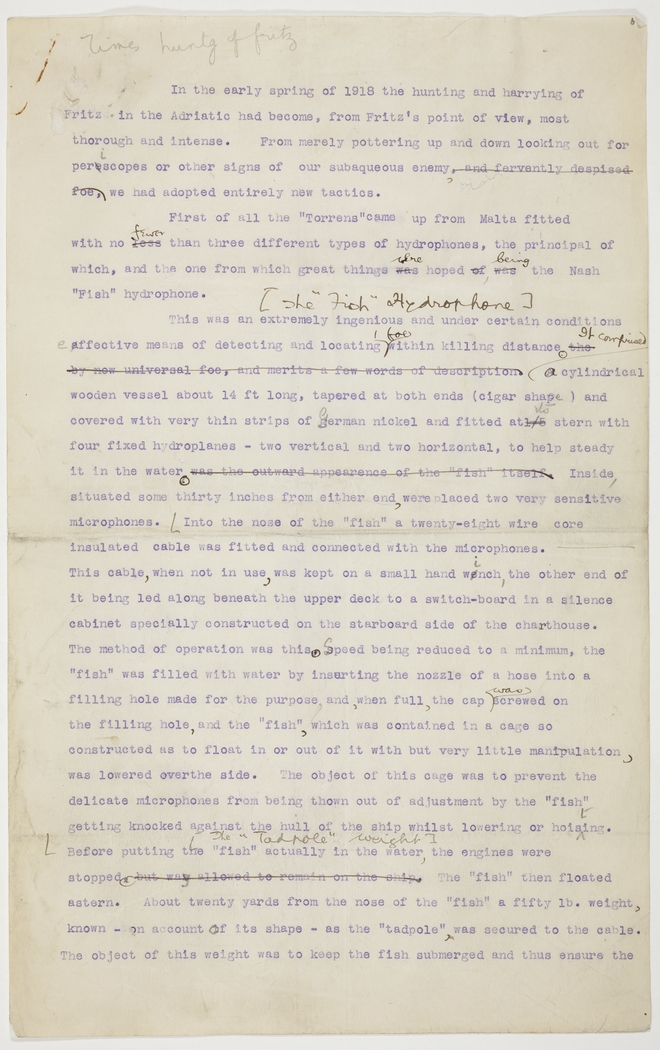 First of all "Torrens" came up from Malta fitted with no less fewer than three different types of hydrophones, the principal of which, and the one from which great things was were hoped being the Nash "Fish" hydrophone.
