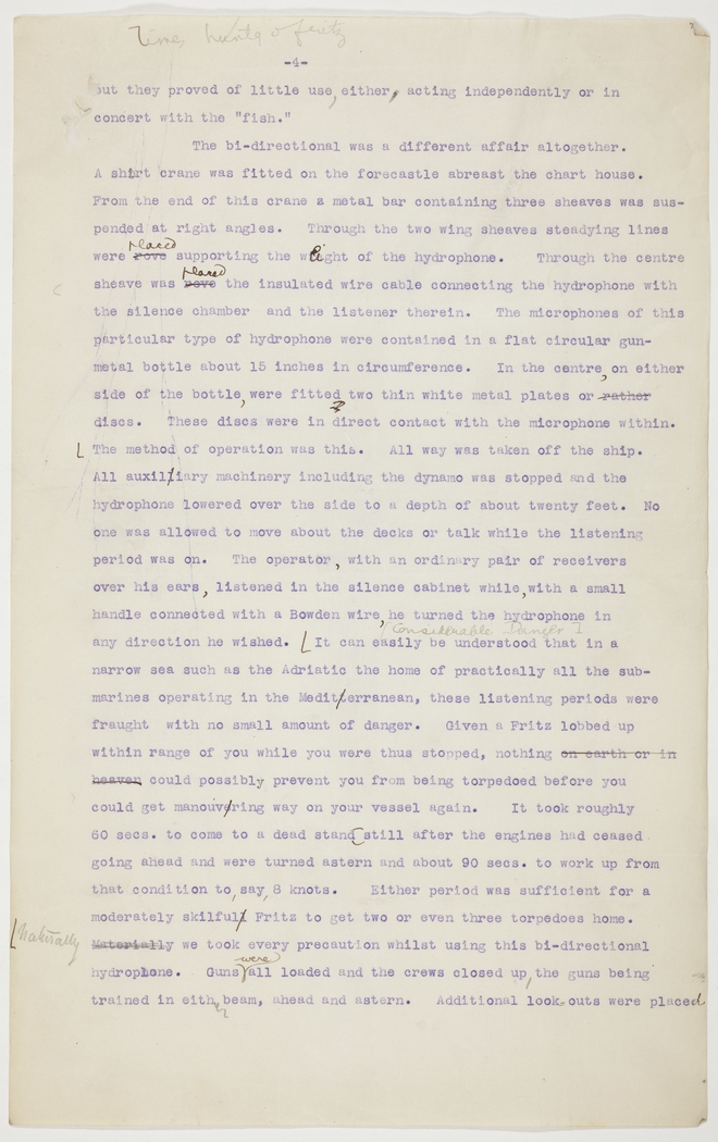 It can easily be understood that in a narrow sea such as the Adriatic the home of practically all the submarines operating in the Mediterranean, these listening periods were fraught with no small amount of danger. Given a Fritz lobbed up within range of you while you were thus stopped, nothing could possibly prevent you from being torpedoed before you could get manouvring way on your vessel again. It took roughtly 60 secs. to come to a dead standstill after the engines had ceased going ahead and were turned astern and about 90 secs. to work up from that condition to, say, 8 knots. Either period was sufficient for a moderately skilful Fritz to get two or even three torpedoes home. Naturally we took every precaution whilst using this bi-directional hydrophone. Guns were all loaded and the crews closed up, the guns being trained in either beam, ahead and astern. Additional look-outs were placed