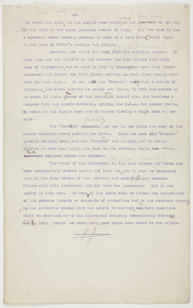 However, not until May 14, 1918 did anything happen. By this time all the T.B.D's on the barrage had been fitted with this type of hydrophone, and we used to stop by Greenwich mean time simultaneously and listen for five minute periods so many times during each hour day and night. On May 14 the "Phoenix" which, after a period of listening, had first started to gather way again, in fact had worked up to about 12 knots (the speed of the patrol was 16 knots) when she received a torpedo fair and square amidship, killing the E.R.A. and stoker rating on watch in the Engine room and of course blowing a huge hole in her side.
