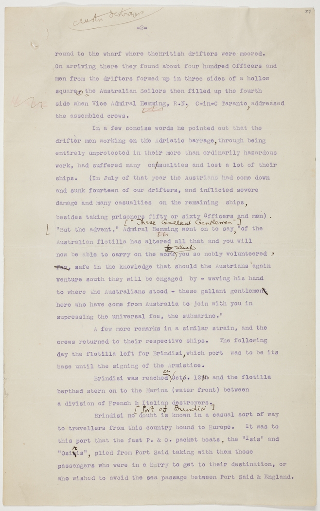 round to the wharf where the British drifters were moored. On arriving there they found about four hundred Officers and men from the drifters formed up in three sides of a hollow square. The Australian Sailors then filled up the fourth side when Vice Admiral Hemming, R.N., C-in-C Taranto, addressed the assembled crews.