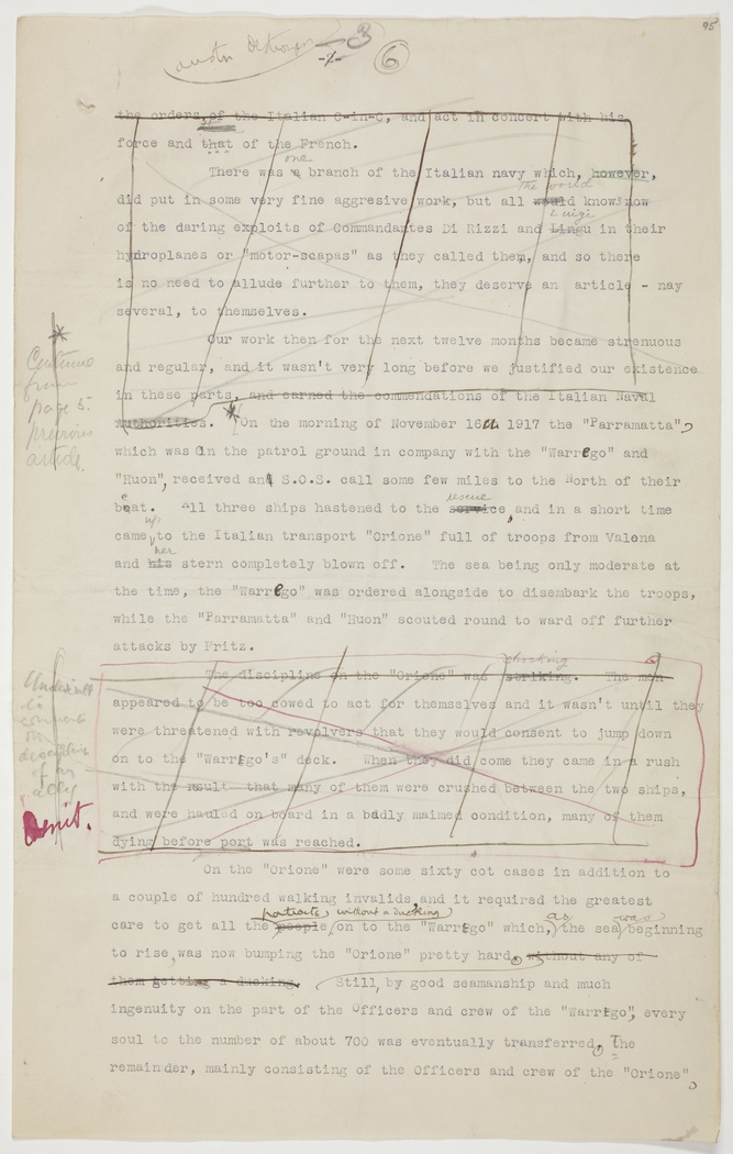 On the morning of November 16th 1917 the "Parramatta", which was on the patrol ground in company with the "Warrego" and "Huon", received an S.O.S. call some few miles to the North of their beat. All three ships hastened to the rescue, and in a short time came up to the Italian transport "Orione" full of troops from Valona and her stern completely blown off. The sea being only moderate at the time, the "Warrego" was ordered alongside to disembark the troops, while the "Parramatta" and "Huon" scouted round to ward off further attacks by Fritz.