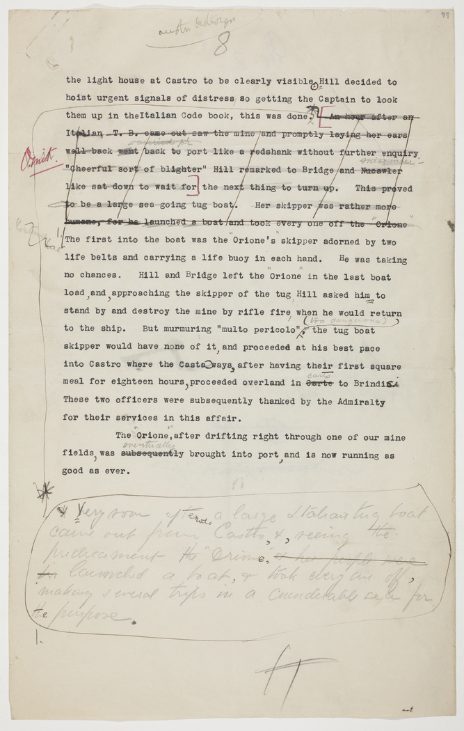The first into the boat was the "Orione's" skipper adorned by two life belts and carrying a life buoy in each hand. He was taking no chances. Hill and Bridge left the "Orione" in the last boat load, and, approaching the skipper of the tug, Hill asked him to stand by and destroy the mine by rifle fire, when he would return to the ship. But murmuring "multo pericolo" (too dangerous), the tug boat skipper would have none of it, and proceeded at his best pace into Castro where the castaways, after having their first square meal for eighteen hours, proceeded overland in carts to Brindisi. These two officers were subsequently thanked by the Admiralty for their services in this affair.