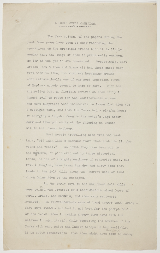 The News columns of the papers during the past four years have been so busy recording the operations on the principal fronts that it is little wonder that the seige of Aden is practically unknown, so far as the public are concerned. Mesopotamia, East Africa, New Guinea and Samoa all had their cable news from time to time, but what was happening around Aden (strategically one of our most important links of Empire) nobody seemed to know or care. When the Australian T.B.D. flotilla arrived at Aden early in August 1917 en route for the Meditteranean no one was more surprised than themselves to learn that Aden was a beseiged town, and that the Turks had a playful habit of bringing a 12 pdr. down to the water's edge after dark and take pot shots at the shipping at anchor within the inner harbour.