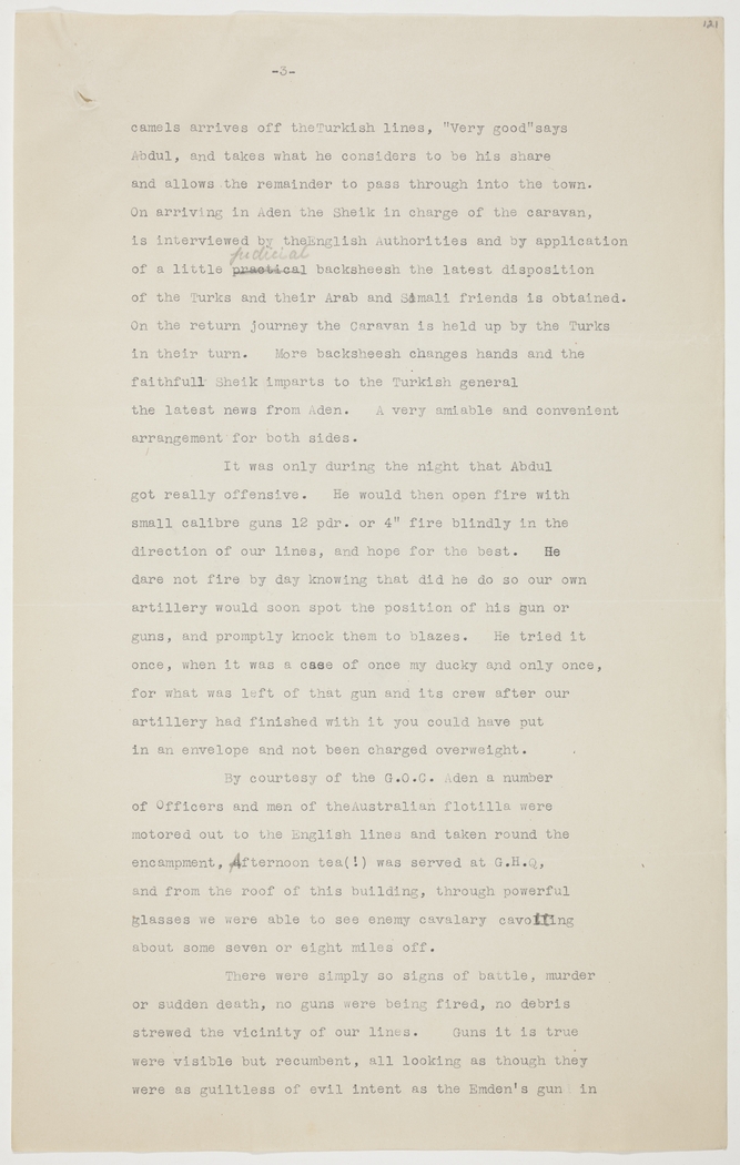 By courtesy of the G.O.C. Aden a number of Officers and men of the Australian flotilla were motored out to the English lines and taken round the encampment. Afternoon tea (!) was served at G.H.Q, and from the roof of this building, through powerful glasses we were able to see enemy cavalry cavorting about some seven or eight miles off.