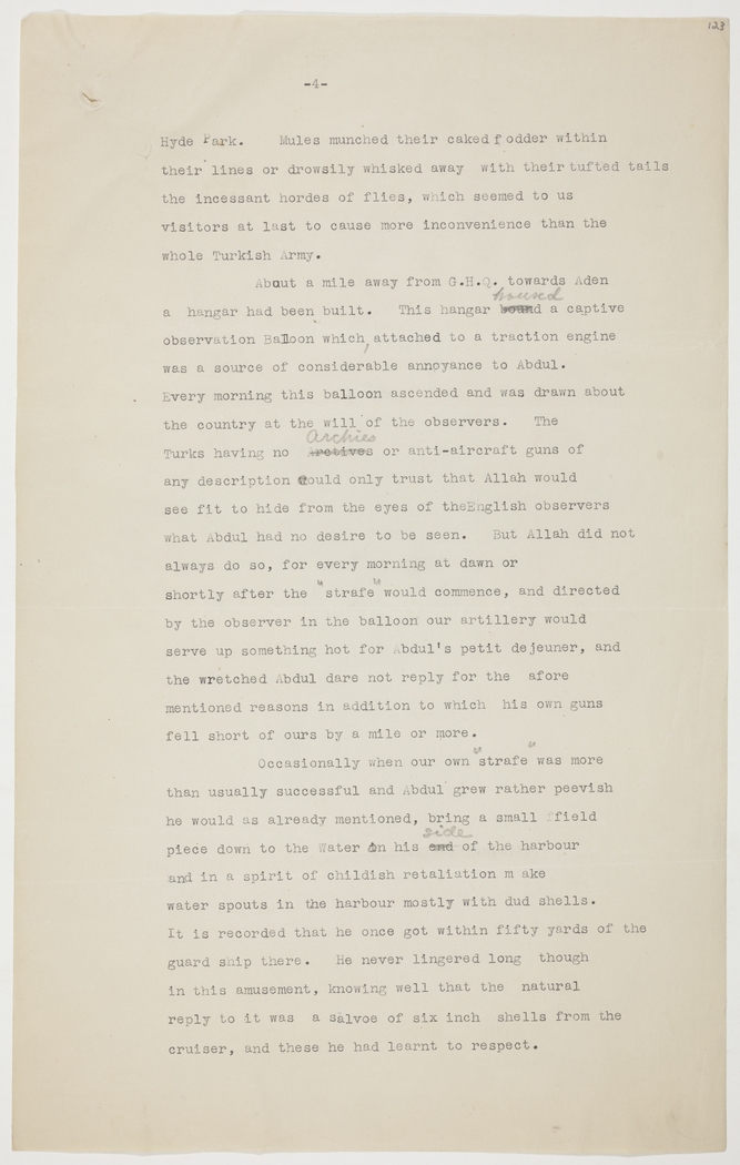 About a mile away from G.H.Q. towards Aden a hangar had been built. This hangar bound housed a captive observation Balloon which, attached to a traction engine was a source of considerable annoyance to Abdul. Every morning this balloon ascended and was drawn about the country at the will of the observers. The Turks having no Arctives Archies or anti-aircraft guns of any description could only trust that Allah would see fit to hide from the eyes of the English observers what Abdul had no desire to be seen. But Allah did not always do so, for every morning at dawn or shortly after the "strafe" would commence, and directed by the observer in the balloon our artillery would serve up something hot for Abdul's petit dejeuner, and the wretched Abdul dare not reply for the afore mentioned reasons in addition to which his own guns fell short of ours by a mile or more.