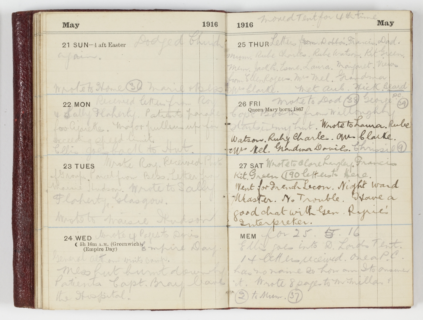 Moved Tent for 4th time. Letters from Dobbo's, Francis, Dad, Mum, Rube Charles. Rube Watson, Kit Green, Mem, Jack R., Esme, Laura, Margaret. Views from Ellen Rogers, Mrs. Mel, Grandma, Mrs Clarke. Met Aub. Hick, beard.