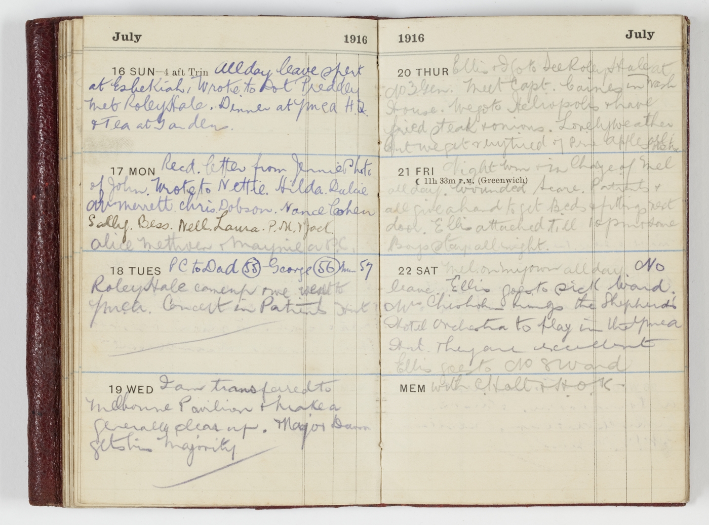 Mel. on my own all day. No leave. Ellis goes to sick ward. Mrs. Chisholm brings the Shepherd's Hotel Orchestra to play in the Y.M.C.A. Hut. They are excellent. Ellis goes to No. 8 Ward with C. Holt & H.O.K.