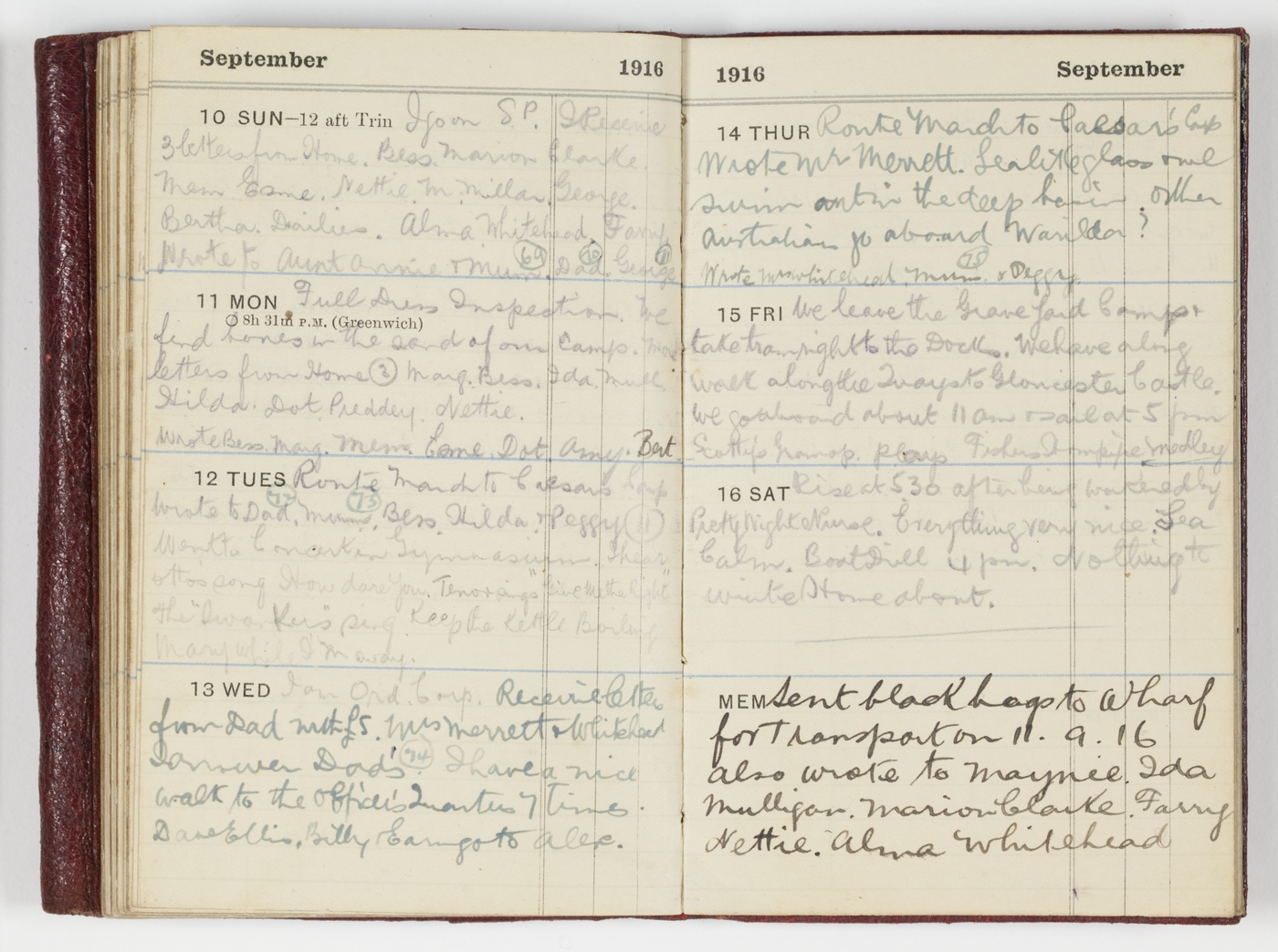 Sent black bags to Wharf for Transport on 11.9.16, also wrote to Maynie, Ida Mulligan, Marion Clarke, Farry, Nettie, Alma Whitehead.
