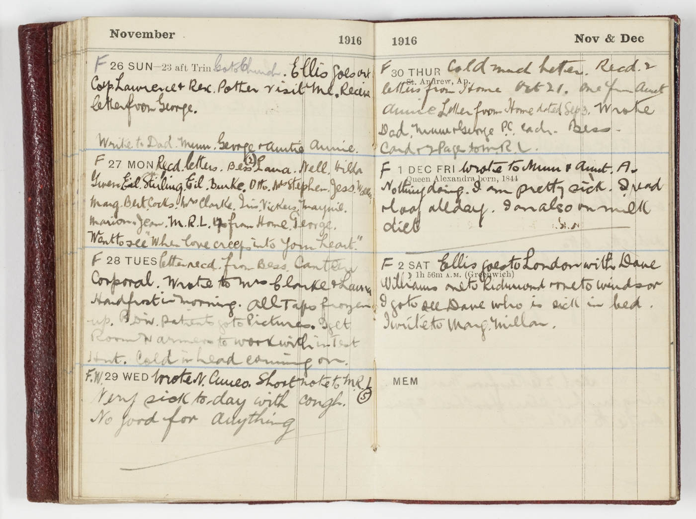 Cold much better. Recd. 2 letters from Home, Oct. 21, one from Aunt Annie, letter from Home dated Sep. 3. Wrote Dad, Mum & George, P.C. each, Bess card & 2 pages to M.R.L.