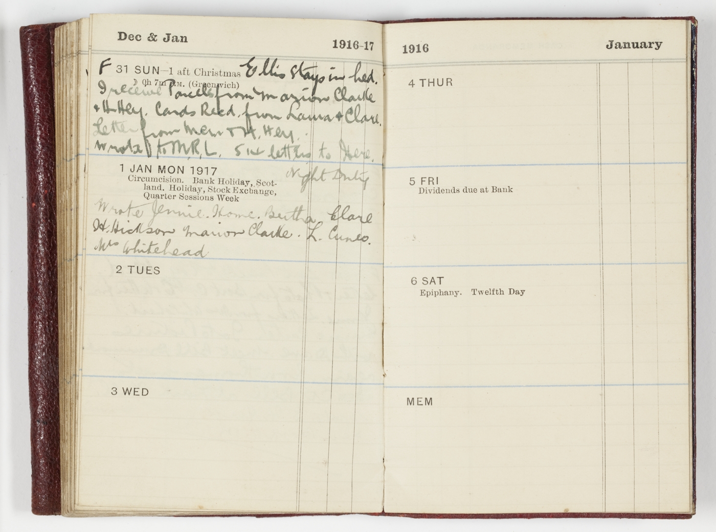 Wrote Jennie, Home, Bertha, Clare, H. Hickson, Marion Clarke, L. Cuneo, Mrs. Whitehead.