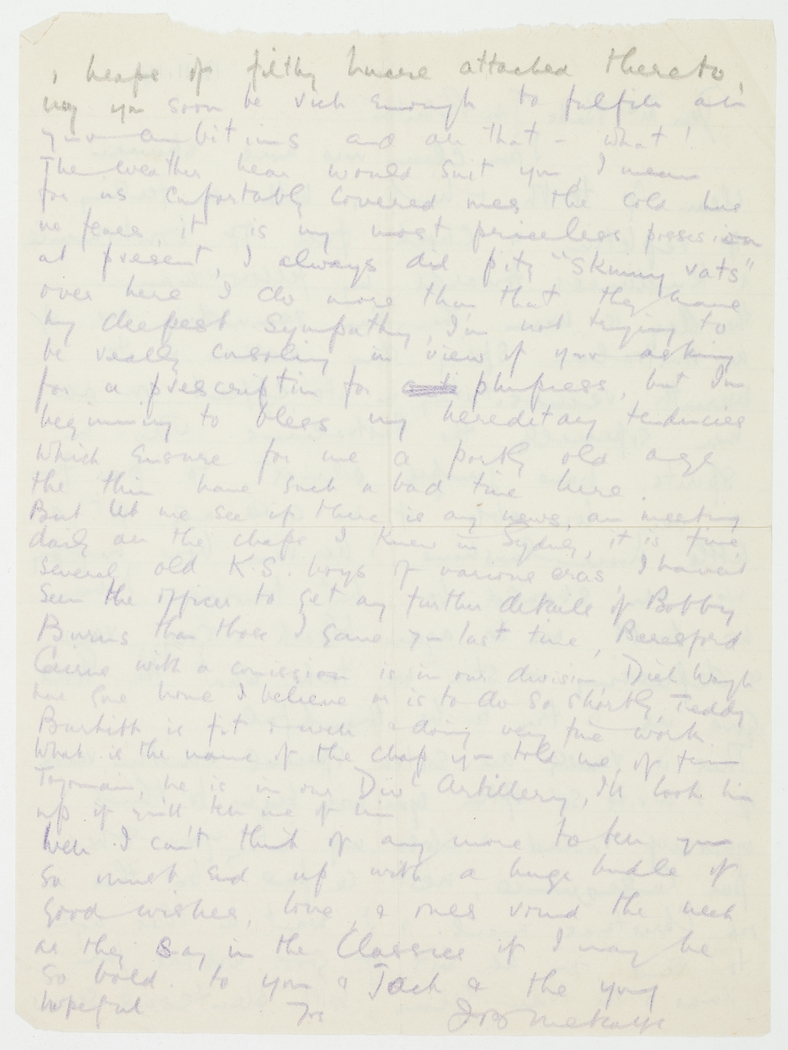 But let me see if there is any news, am meeting daily all the chaps I knew in Sydney, it is fine, several old K.S. [Kings School] boys of various eras. I haven't seen the officer to get any further details of Bobby Burns than those I gave you last time. Beresford Cairns with a comission is in our division, Dick Waugh has gone home I believe or is to do so shortly, Teddy Burkitt is fit & well & doing very fine work. What is the name of the chap you told me of from Togomain [Toganmain], he is in our Divl. Artillery, I'll look him up if you'll tell me of him.
