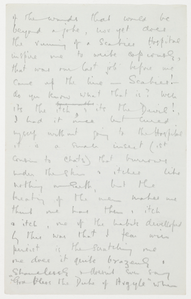 of the wounds that would be beyond a joke, nor yet does the running of a Scabies Hospital inspire me to write copiously, that was our last job before we came up the line – Scabies! – do you know what that is? Well its the itch, & its the Devil! I had it once but cured myself without going to the Hospital, it is a small insect (1st cousin to Chats) that burrows under the skin & itches like nothing on earth, but the treating of the men makes me think one has them & itch & itch, one of the habits developed by this was that I fear will persist is the scratching one one does it quite brazenly & shamelessly & doesn't even say "God bless the Duke of Arlgyle" when