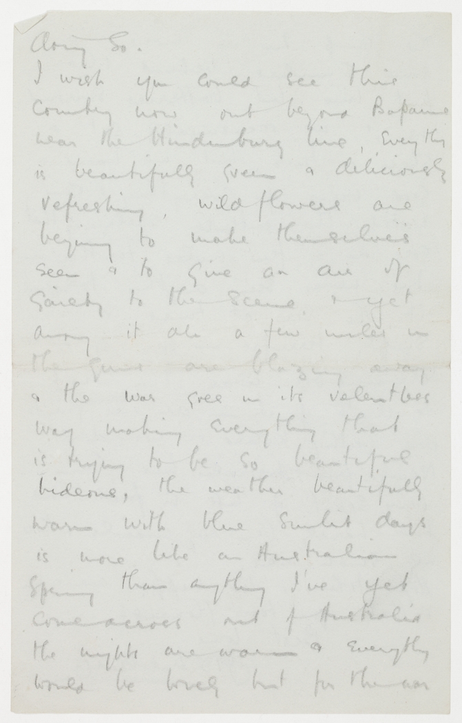 I wish you could see this country now out beyond Bapaume near the Hindenburg line, everything is beautifully green & deliciously refreshing, wild flowers are beginning to make themselves seen & to give an air of gaiety to the scene, & yet among it all a few miles in the guns are blazing away & the war goes on its relentless way making everything that is trying to be so beautiful hideous, the weather beautifully warm with blue sunlit days is more like an Australian Spring than anything I've yet come across out of Australia. The nights are warm & everything would be lovely but for the war.