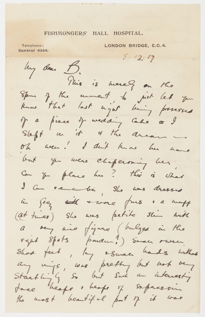 This is merely on the spur of the moment to just let you know that last night being possessed of a piece of wedding cake, I slept on it & the dream – Oh well! I don't know her name but you were chaperoning her, can you place her? This is what I can remember, she was dressed in grey with & wore furs & a muff (at times), she was petite slim with a very nice figure (bulged in the right spots pardon!) small & well shod feet, long & small hands without any rings, was pretty but not very startlingly so but such an interesting face, heaps & heaps of expression. The most beautiful part of it was